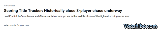 得分王之争又有新的变化。NBA官网数据专家Brian Martin解读最新形势,现在常规赛还剩9天,詹姆斯的领先优势扩大到0.16分。