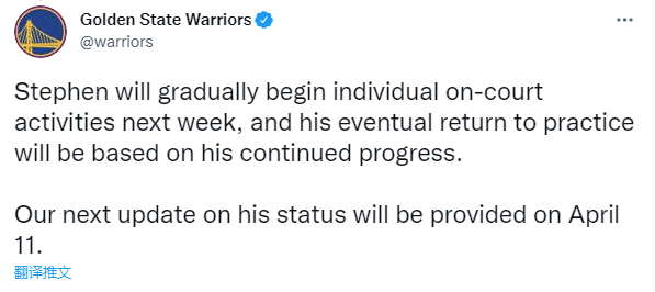 勇士官方宣布,库里在3月17日遭遇左脚韧带扭伤,伤势恢复得很好;过去两周,库里已进行多种恢复训练和承重项目,将在下周逐渐开始个人球场训练,最终回归球队训练的时间将基于他的恢复进程,他将在4月12日进入复查。