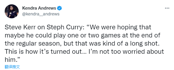 谈到库里常规赛报销,勇士主帅科尔表示:我们原本希望库里或许能够出战常规赛最后一场或两场比赛,但这么做的风险太大。所以我们做出了这样的决定,我对于他的情况并不是很担心;只要一次投篮,他就能找回自己的节奏。