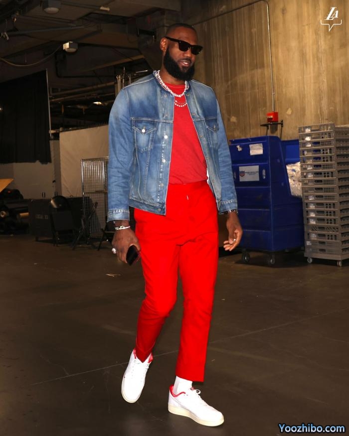 今日赛前,詹姆斯提前4小时抵达球馆,身穿一套红色套装,搭配牛仔外套,还戴着墨镜和钻石项链,早早上场检测脚踝并且接受全天候治疗,最终赛前决定出战。