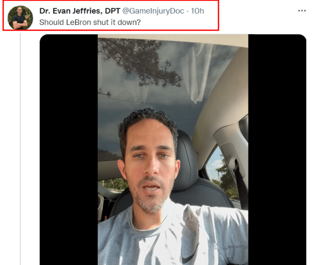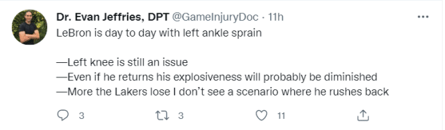 Evan Jeffries说:“詹姆斯是否应该带着他受伤的膝盖和脚踝继续出战本赛季的比赛?这是一个很难回答的问题。特别是考虑到目前湖人的情况,他们还需要赢下一些比赛才能确保打附加赛。不过,詹姆斯也得担心自己的未来,担心他的第20个赛季,那意味着他接近追上贾巴尔了。我知道现在他还得再打3场比赛才能拥有竞争得分王的资格,我能理解这一点,但我相信如果詹姆斯真的上不了,他不会勉强自己。”