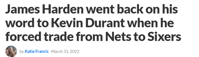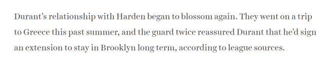 报道称,哈登和杜兰特一度关系很好,两人去年夏天一起去希腊旅游,在旅途中,哈登两次向杜兰特承诺,他会和篮网续约,并长期留在布鲁克林。可是事情的进展并非如此,哈登在休赛期没有和篮网提前续约,交易截止日前也施压球队,将自己送往76人。据此前报道,哈登在今年夏天有资格和76人签一份5年2.7亿美元的顶薪合同。