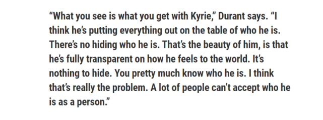 杜兰特喜欢欧文的表里如一。“所见即所得,”杜兰特说,“我认为他把一切都摆在桌面上。没有隐藏,这就是他的美妙之处,就是他对世界的感受完全透明。没什么好隐瞒的。你几乎知道他的一切。我认为这确实是问题所在,很多人无法接受他。”
