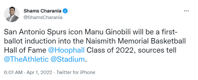 无论如何,吉诺比利终于获得他的生涯终极荣誉,想必到时候邓肯和帕克都会赶来为他庆祝。2022名人堂的颁奖仪式计划在9月10日-11日举行。
