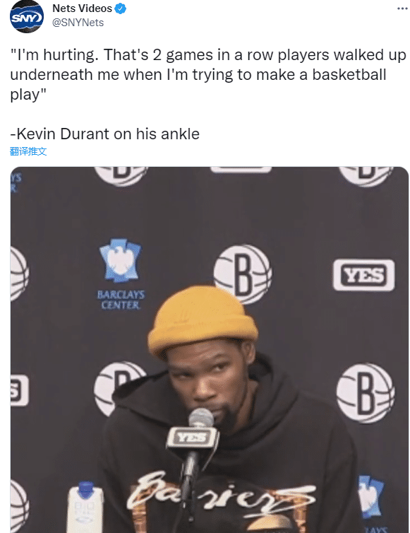 杜兰特谈到脚踝伤势:我受伤了,这是连续两场比赛,当我投篮时,有球员撞倒了我;KD还透露他的脚踝无碍,不会缺席任何的比赛;谈到错失绝杀,杜兰特表示他觉得自己最后几次投篮的“运气不错”。