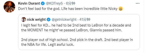 福克斯体育主持人Nick Wright发推写道:我对KD有一种感觉……过去10年他是勒布朗后联盟第二好的球员,在他即将超过勒布朗的那一刻,扬尼斯超过了他;高中第二好的球员,选秀第二顺位,终生都是NBA第二好的球员,太倒霉了。