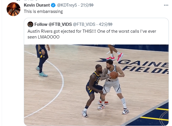 来源:JRS直播03-31 16:18JRS直播03月31日讯 ,掘金客场125-118击败步行者,末节场上发生意外事件,小里弗斯连续吃到两个技术犯规被驱逐离场,小里弗斯“肘击”史蒂芬森冲上热搜引热议,美媒直呼根本没打到师弟,杜兰特凑热闹,转发视频并发推:这也太尴尬了。