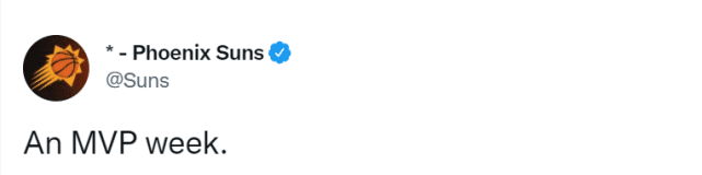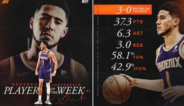 上周,太阳也打出3胜0负的战绩,布克场均37.3分6.3助攻3篮板,投篮命中率58.1%,三分命中率42.9%。太阳官方晒图祝贺布克,并配文写道:“MVP的一周”。