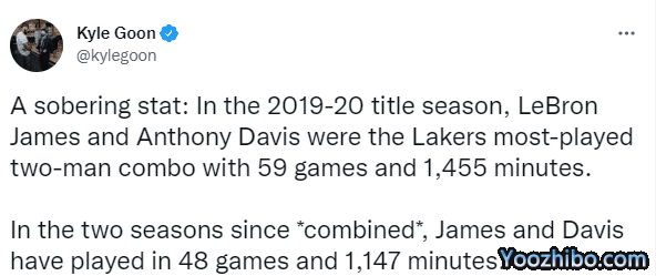 湖人记者Kyle Goon发推:一个发人深思的数据:在2019-20赛季,詹姆斯和戴维斯是湖人队出场次数最多的两人组合,出战59场,上场时间1455分钟;在最近两个赛季中,詹姆斯和戴维斯仅仅一起打了 48 场比赛和 1,147 分钟。