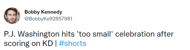 这一幕发生在距离上半场结束还有1分49秒的时候。当时PJ-华盛顿接拉梅洛-鲍尔的传球,面对杜兰特的贴身防守,运了三下球后勾手命中。慢镜头显示,华盛顿进球后转身做了一个“太矮”的手势,算是对杜兰特防守的嘲讽。美媒发出这个视频后,球迷们展开热议,有球迷认为华盛顿太狂,也有球迷认为这是故意回应杜兰特前阵子嘲讽别人的行为。