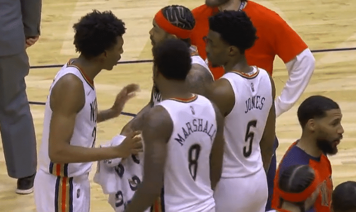 节比赛开始后,湖人进攻端连续不中,麦科勒姆造犯规两罚一中,墨菲中投得分,随后的三分投射也中,詹姆斯抛投得分帮助湖人打破得分荒,墨菲三分命中,瓦兰造犯规两罚全中,鹈鹕反超了比分,詹姆斯上篮回应,麦科勒姆高难度抛投命中,湖人请求暂停,比赛打了5分钟的时间,湖人仅仅由詹姆斯得到了4分。暂停回来蒙克上篮得分,麦科勒姆、英格拉姆连续得分,鹈鹕领先2分。
