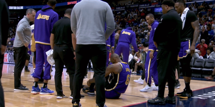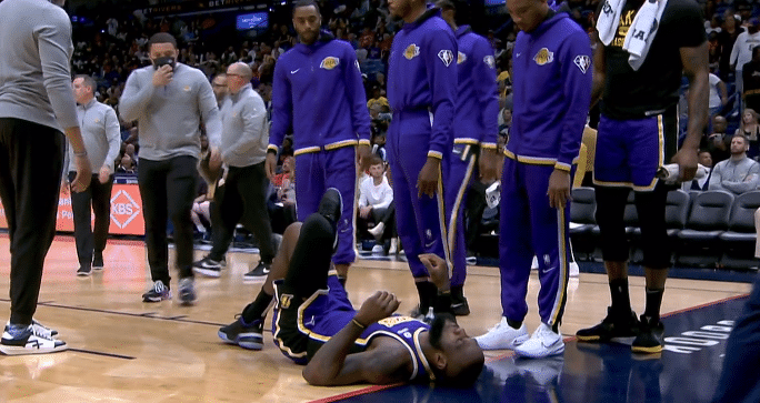 詹姆斯受伤一幕曝光,第二节10分多钟,詹姆斯冲到禁区准备抢篮板,不慎踩到海斯的脚,导致左脚踝呈90度崴伤,老詹痛苦倒地不起,鹈鹕5打4反击,之后湖人暂停,詹姆斯躺在地板上换了一会,之后起身重新绑紧鞋带,在场上走了几圈,然后坐回替补席,又重新绑紧鞋带,继续上场打比赛。