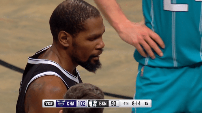 下半场,欧文第三节5投0中又狂打铁,篮网落后打得很被动;于是杜兰特开始发力,单节11投6中独砍15分,扛起进攻大旗,并且凭借此节最后时刻的6-0追到4分。