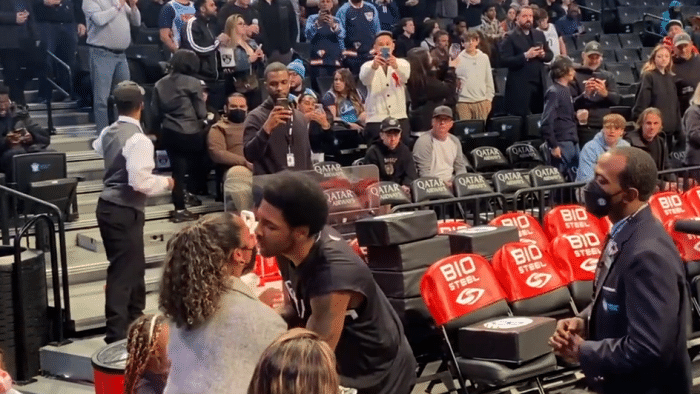 当现场DJ介绍欧文入场时,篮网主场球迷集体为他起立欢呼,今日篮网主场上座人数创赛季新高;欧文不仅拥抱亲吻自己的孩子,而且当众亲吻爱妻秀恩爱。
