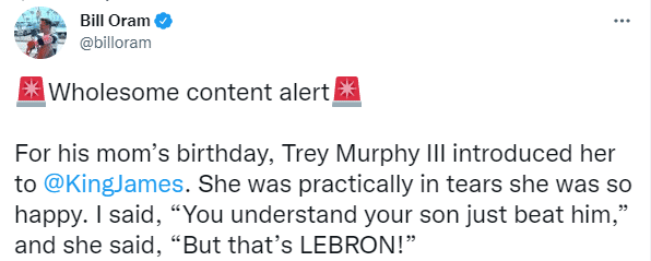 赛后詹姆斯满足鹈鹕新星墨菲的一个愿望,在墨菲母亲生日这一天,他把母亲介绍了詹姆斯,两人合影留念;他的母亲喜极而泣,几乎泪流满面;此战詹姆斯左脚踝绑着绑带。