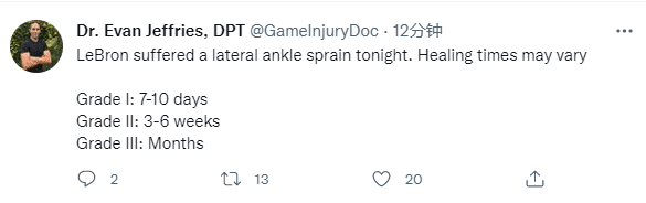 医学专家Evan Jeffries详解詹姆斯的伤情,发推写道:勒布朗遭遇脚踝外翻,一级扭伤需要休战7-10天,二级扭伤需要休战3-6周,三级扭伤则伤停数月。