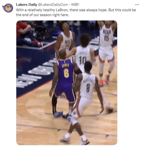 美媒Lakers Daily晒出詹姆斯崴脚瞬间,发推写道:一个健康的詹姆斯,可以让湖人看到希望,但这可能意味着我们的赛季结束了。