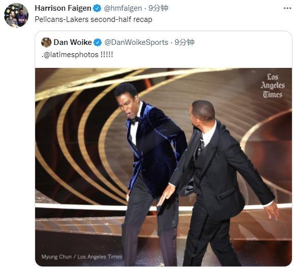 湖人随队记者Harrison Faigen转发掌掴图,并写道:这就是湖人与鹈鹕下半场的缩影;今天湖人惨遭鹈鹕23分大逆转,下半场净输28分。