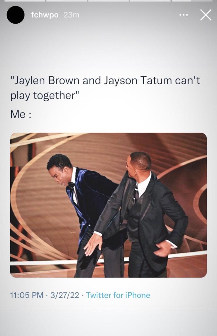凯尔特人球星杰伦-布朗在Ins上转发掌脸图,回应外界质疑他和塔图姆不能在一起打比赛;约什-哈特:他真的掌掴克里斯-洛克并且赢得奥斯卡。