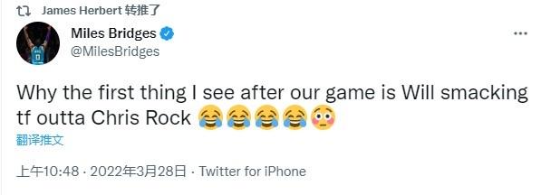 黄蜂球员布里奇斯发推:为什么我在比赛结束后看到的第一件事就是威尔-史密斯掌掴主持人;小托马斯转发视频并发推:我的天呐,真给了他一巴掌。