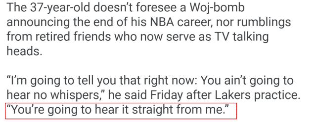“我现在可以告诉你:你不会听到任何小道消息,你会直接从我这里听到(宣布退役的消息)。”说这番话的安东尼,显得霸气十足。甜瓜的意思很明白,等到他离开赛场的那一刻,他会亲自宣布这个消息。