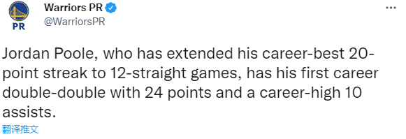 来源:JRS直播03-26 15:40JRS直播03月27日讯 ,勇士客场110-121不敌老鹰,库里因伤继续休战,普尔全场22投8中、三分13中4拿到24分10助攻4篮板,上下半场判若两人,上半场13中8拿到22分,下半场9投0中仅靠罚球拿到2分;不过普尔创纪录——连续12场20+继续刷新生涯纪录,仅次于里克-巴里勇士队史第二年轻达成如此成就的球员,10次助攻创生涯新高,生涯首次20+10两双。