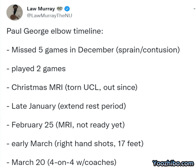 快船记者晒出了乔治的肘部伤势的进程表——