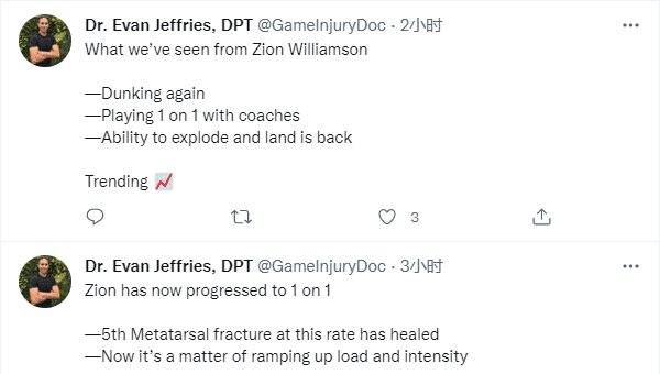 对于锡安的情况,医学专家Evan Jessries透露三大康复喜讯,一是锡安第五跖骨骨折已经愈合,二是爆发力和落地能力回来了,三是和教练1对1训练,增加负荷和训练强度。