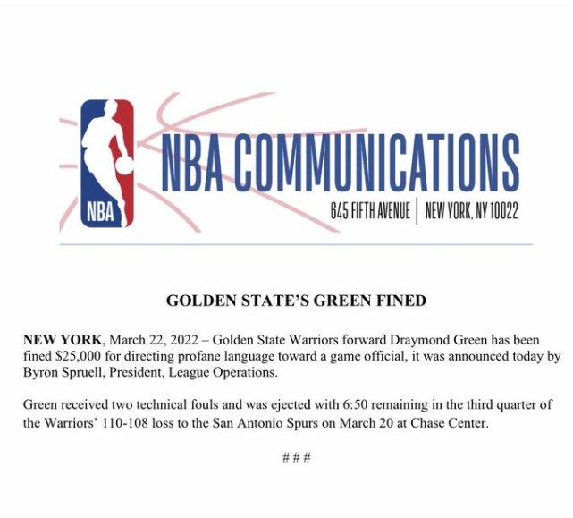 勇士球员追梦因在上一场勇士对阵马刺的比赛中被向裁判发表亵渎语言被罚款2.5万美元。比赛第三节,追梦在一次防守中被吹阻挡,他对这次判罚很不满,之后抱怨裁判连吃两T被罚出场。