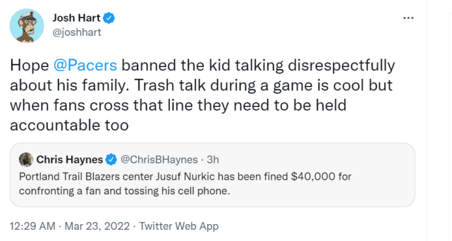 名记Chris Haynes报道称,消息人士透露,在步行者主场与努尔基奇发生冲突的球迷当时辱骂了努尔基奇的妈妈与祖母,努尔基奇的祖母已在2020年死于新冠。队友哈特发推声援努尔基奇,他写道:“希望步行者队可以禁止这个孩子说不尊重他(努尔基奇)家人的话。在比赛中喷垃圾话很酷,但是当球迷越界时,他们也需要承担责任。”
