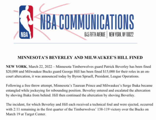 贝弗利和希尔也挨罚了。在3月20日雄鹿对森林狼的比赛中,雄鹿球员伊巴卡与森林狼球员普林斯在篮板球卡位时发生争执,贝弗利冲上前推了伊巴卡一把,之后希尔去推了贝弗利,双方险些爆发冲突,裁判之后迅速将所有人分开。最终,贝弗利与希尔被驱逐出场,伊巴卡领到一个技术犯规。贝弗利因为他的举动被罚了2万美元,而希尔在场上争吵被罚了1.5万美元。