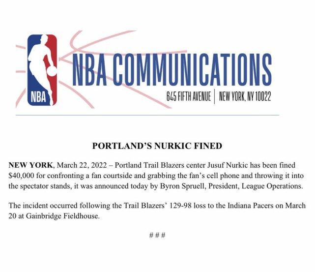 根据官方开出的罚单,3月21日开拓者对步行者的比赛,努尔基奇在场边与一名球迷对峙,抢夺该球迷的手机并把它扔到了观众席上。这一举动,被NBA罚款4万美元。