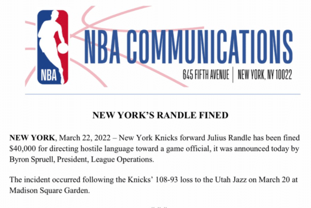兰德尔因在赛后对比赛官员使用敌意语言而被罚款40000美元。NBA官方表示,兰德尔的违规行为发生在21日主场不敌爵士的比赛结束之后。据悉,兰德尔本赛季累计罚款已经达到15.5万美元。
