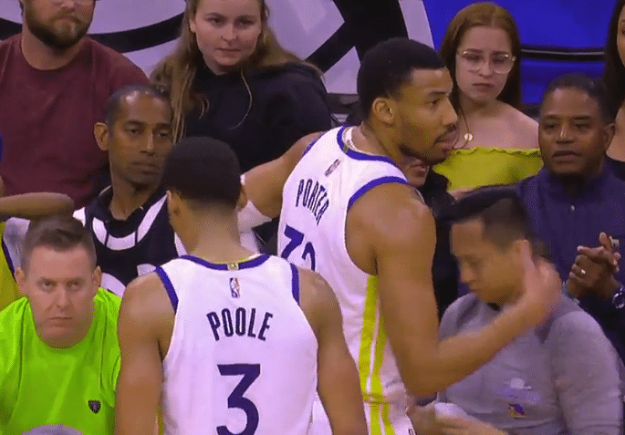 第三节的比赛,熟悉的勇士三疯回来了,克莱连续得分,比赛中段波特一攻一防非常精彩,他先是在防守端上演了精彩的大帽,随后进攻端又命中了追身三分,勇士这边的三分彻底投开了,普尔,维金斯,克莱连续命中三分球,勇士反超了比分,三节比赛打完的时候,勇士反超了9分。