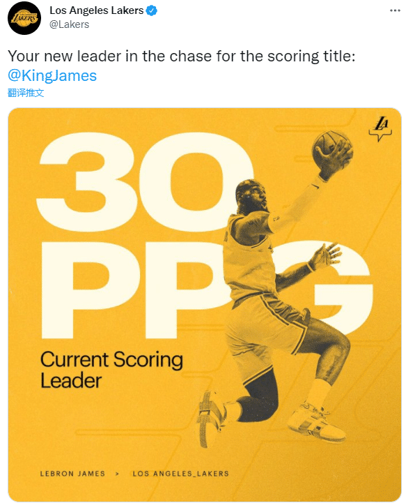 来源:JRS直播03-23 09:31JRS直播03月23日讯 湖人官方为詹姆斯冲击得分王造势,晒出詹姆斯场均30分领跑联盟,发推写道:詹姆斯是得分王之争新的领头羊;若37岁詹姆斯夺得本赛季得分王,他将创造新的历史,成为史上最年老得分王。