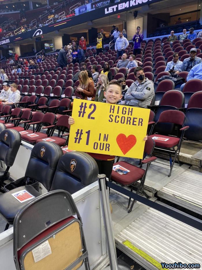 骑士主场小球迷举着标牌,写着“历史得分榜第二,我们心中的第一”和“勒布朗,回家吗?!”一方面恭喜詹姆斯升到历史第二,另一方面希望詹姆斯重返骑士。