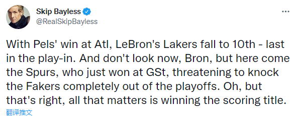 对于湖人的现状,全美第一詹黑斯基普-贝勒斯又发推,写道:随着鹈鹕赢球,勒布朗的湖人队跌至第 10 位,在附加赛中排名最后。而且别光看着眼前,现在马刺也来了,他们刚刚击败勇士,他们威胁要将假湖人彻底淘汰出季后赛。哦,不过,没错,最重要的事是赢得得分王。
