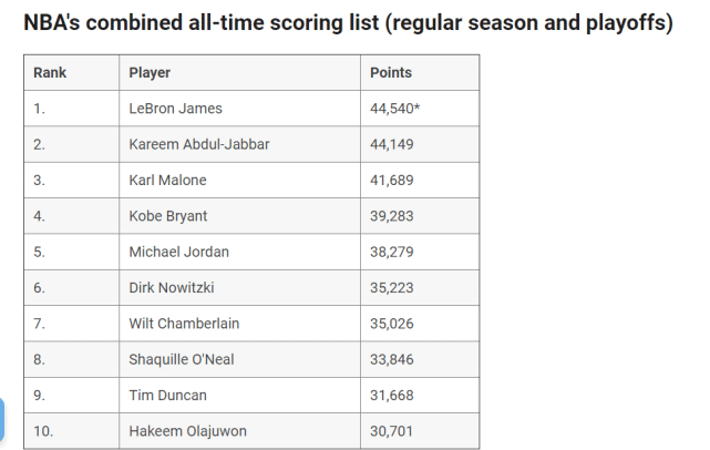 需要说明的是以上所说的得分榜,是常规赛生涯总得分,而在常规赛+季后赛生涯总得分方面,詹姆斯已经是历史第一,对奇才一战前,詹姆斯的总得分是44540分(常规赛36909分+季后赛7631分),排名历史第二的贾巴尔是44149分。