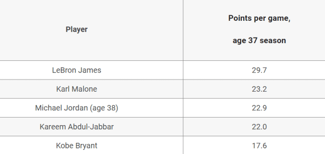 来源:JRS直播03-20 16:44JRS直播03月20日讯 ,本赛季至今,詹姆斯场均能得到29.7分,对于一位37岁的老将来说,这真的不容易。美媒晒出了同为37岁赛季的球星对比:詹姆斯29.7分、马龙23.2分、乔丹22.9分(38岁)、贾巴尔(22.0分)、科比(17.6分)。