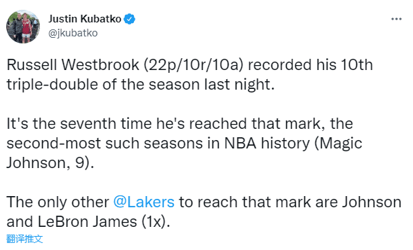 此外,湖人队史能够做到单赛季拿下至少10次三双的还有詹姆斯(1次)。