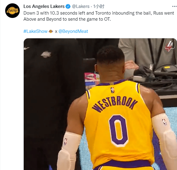 湖人官方又晒出威少抢断并投进绝平三分的精彩时刻,昨天湖人加时击败猛龙,威少在第四节还剩10秒并且落后3分的情况下,抢断并且 迎着巴恩斯投进绝平三分,加时赛关键时刻助攻布拉德利,全场拿到22分10篮板10助攻,带领湖人拿下胜利。