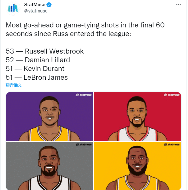 如此数据体现出威少的大心脏属性,生涯53次在最后60秒投进关键球,力压詹姆斯、杜兰特和利拉德为同期联盟最多。