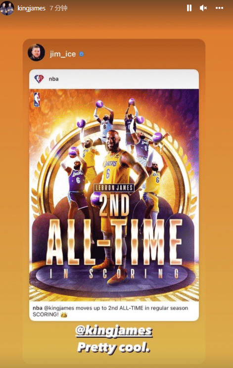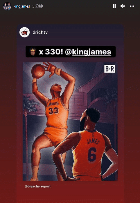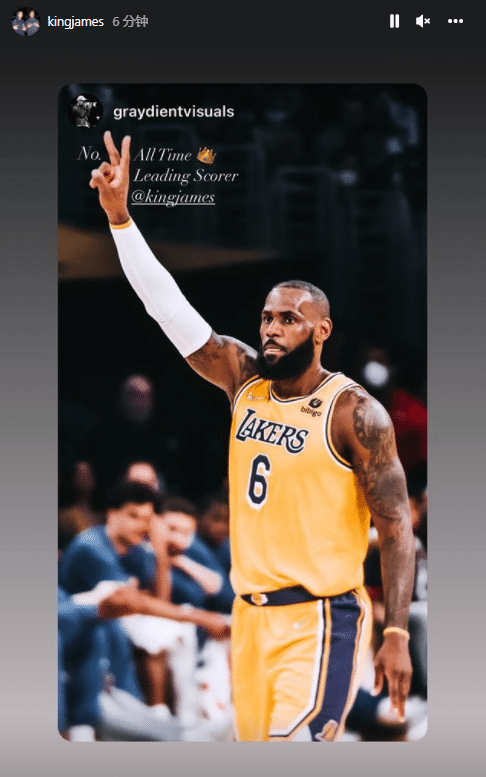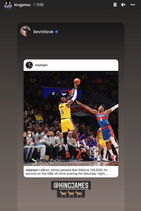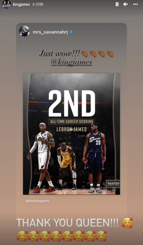 詹姆斯在Ins上连续转发数十条动态,感谢爱妻的祝贺,配文写到:谢谢你,女王(飞吻表情),还转发湖人官方以及美媒、好友的祝贺,乐福直呼詹姆斯是历史最佳。