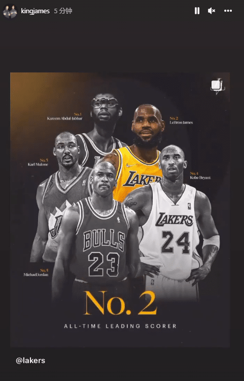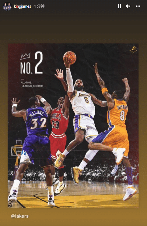 湖人客场惨遭16分大逆转,詹姆斯超越卡尔-马龙的纪录之夜又输球,全场拿到38分10篮板6助攻;赛后詹姆斯连续更新多条动态,庆祝自己常规赛总得分升到历史第二位。