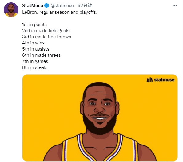 来源:JRS直播03-20 14:43JRS直播03月20日讯 ,美媒StatMuse把推特头像换成詹姆斯的漫画照,晒出詹姆斯常规赛+季后赛的九大关键数据都排在历史前十之列——总得分历史第一、总进球数历史第二、总罚球命中数历史第三、总胜场数历史第四、总助攻历史第五、总三分命中数历史第六、总出场数历史第七和总抢断数历史第八。