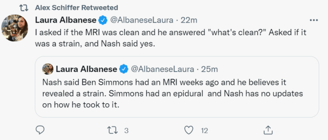 在今天的采访中,纳什先是透露西蒙斯在几周前做了核磁共振检查,随后一个记者追问:“核磁的结果是不是clean?”纳什回应到:“什么是clean?”当被问到是不是有拉伤一类的问题时,纳什给出了肯定的答案。