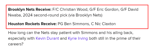 美媒Bleacher Report建议篮网在休赛期送走西蒙斯,列出的是一笔2换4的方案:篮网送出西蒙斯和克拉克斯顿,得到火箭的伍德、戈登、努瓦巴、2024年的次轮签(原属于篮网)。