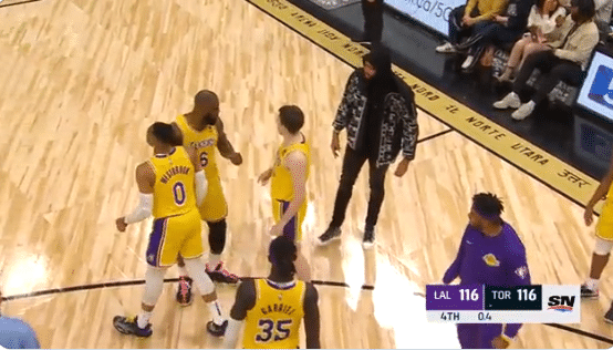 第四节,詹姆斯连续杀到禁区得分,湖人和猛龙展开持久拉锯战;关键时刻,詹姆斯投进高难度打板三分,之后跟进补扣,老詹迎着防守回应后仰三分,此时詹姆斯摇头晃脑疯狂庆祝,可惜老詹致命失误,特伦特回应高难度关键三分,詹姆斯和威少续命三分都不进,但终场前10秒,威少抢断并且投进绝平三分。