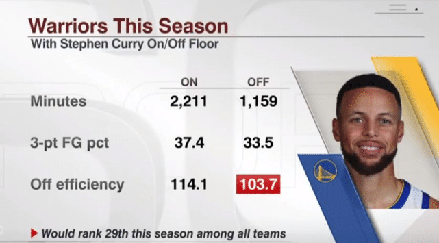 再让我们来看看本赛季库里在不在场,勇士的表现有什么变化。数据显示,本赛季库里在场的2211分钟,勇士的三分命中率37.4%,进攻效率114.1,几乎相当于联盟第4位的水准;。库里不在场的1159分钟,勇士的三分命中率只有33.5%,进攻效率跌到103.7,这相当于联盟第29位的水准第4变第29,这就是勇士进攻没有库里可能会面临的困境。