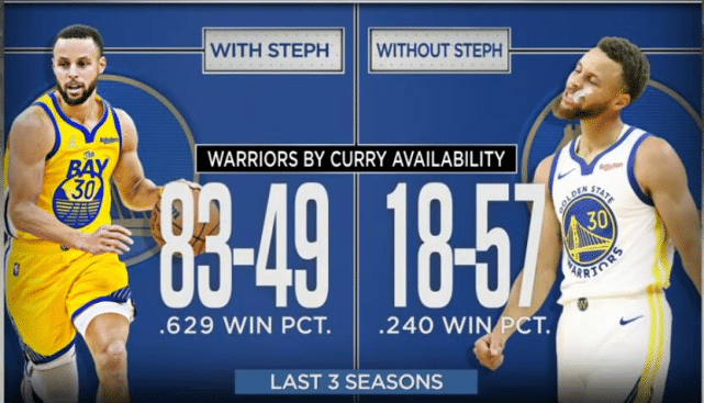 首先,过去3个赛季,库里出战的比赛,勇士83胜49负,胜率高达62.9%,相当于本赛季的雄鹿(44胜26负,胜率62.9%)。而过去3个赛季,库里缺席的比赛,勇士18胜57负,胜率只有24.0%,还不如本赛季的火箭(17胜52负,胜率24.6%)。有没有库里,勇士简直是两支球队。